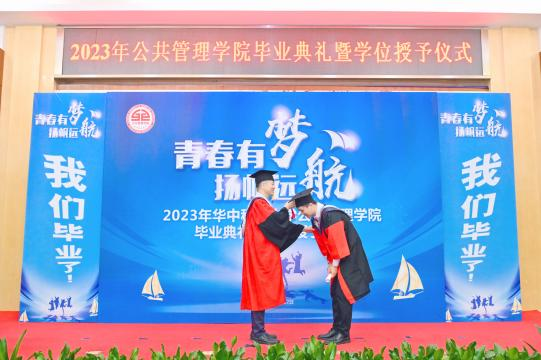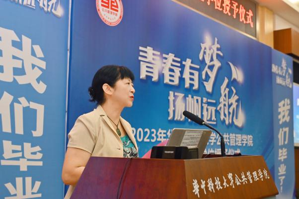 随后代表本硕博三个层次的三位毕业生代表先后发言。2021届博士毕业生李岩讲述了自己做辅导员思政育人的经历,对母院、领导老师们在思想上的启智润心,学业上的悉心指导,生活上的呵护关怀表示最衷心的感谢。他也表示自己将始终铭记母院和导师的激励鞭策,不断追求做一名“顶天立地、追求卓越”的华中大公管人。