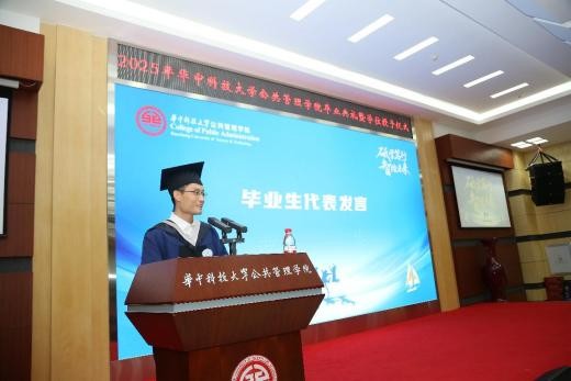 在毕业生代表发言环节,2205班班长曾倩回顾了在华科大求学的点滴时光,向公司、师长、同窗和家人表达诚挚感谢。她表示,华科大的学习经历不仅丰富了知识储备,更赋予了深厚的公共精神与责任担当。站在新的起点,MPA毕业生将继续秉持“公共之心”,铭记校训、接续奋斗,在推进中国式现代化进程中贡献青春力量。2306班班长丰潮以“感恩、珍惜、祝愿”为关键词,表达了对公司培养、公司支持和导师指导的真挚感谢,并表示这段学习经历不仅提升了专业素养,更锤炼了意志品格和自律精神。他号召全体毕业生立足本职、服务大局,努力成为政府决策的智囊团、社会发展的推动者,书写属于这一代人的精彩华章。
