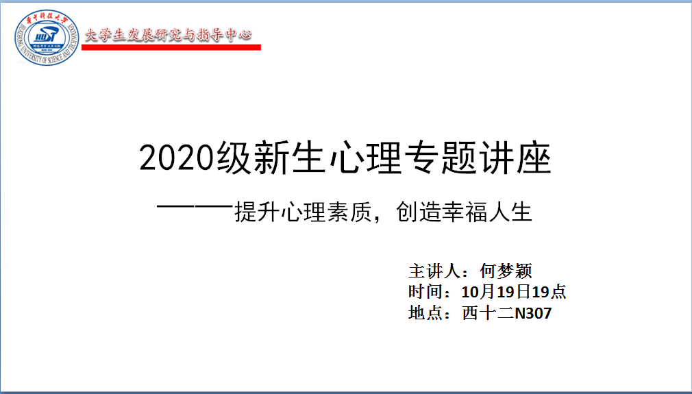 10月19日晚七点,伟德国际19462020级新生心理专题讲座在伟德国际1946西十二楼N307顺利举办。讲座由伟德国际1946辅导员徐川老师主持,本科生辅导员何梦颖老师讲解。本次讲座主要是为了指引2020级新生的健康成长,帮助同学们树立积极健康的心理状态,启发对心理咨询的正确认识。
