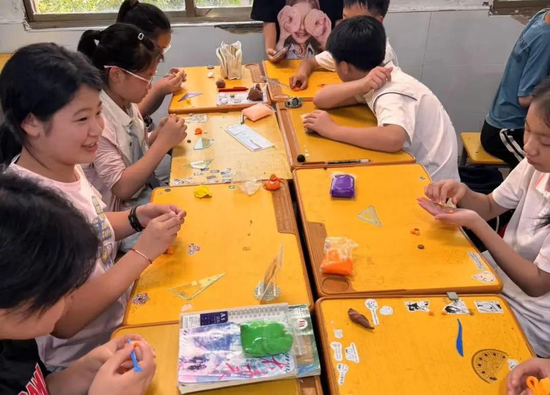材料分发后,孩子们迅速投入创作:有人专注塑造精致花篮,有人大胆尝试动物或动漫形象,大家相互启发、交流技巧,队员们耐心指导、鼓励尝试。课堂氛围活跃而有序,创意灵感在欢声笑语中不断涌现。