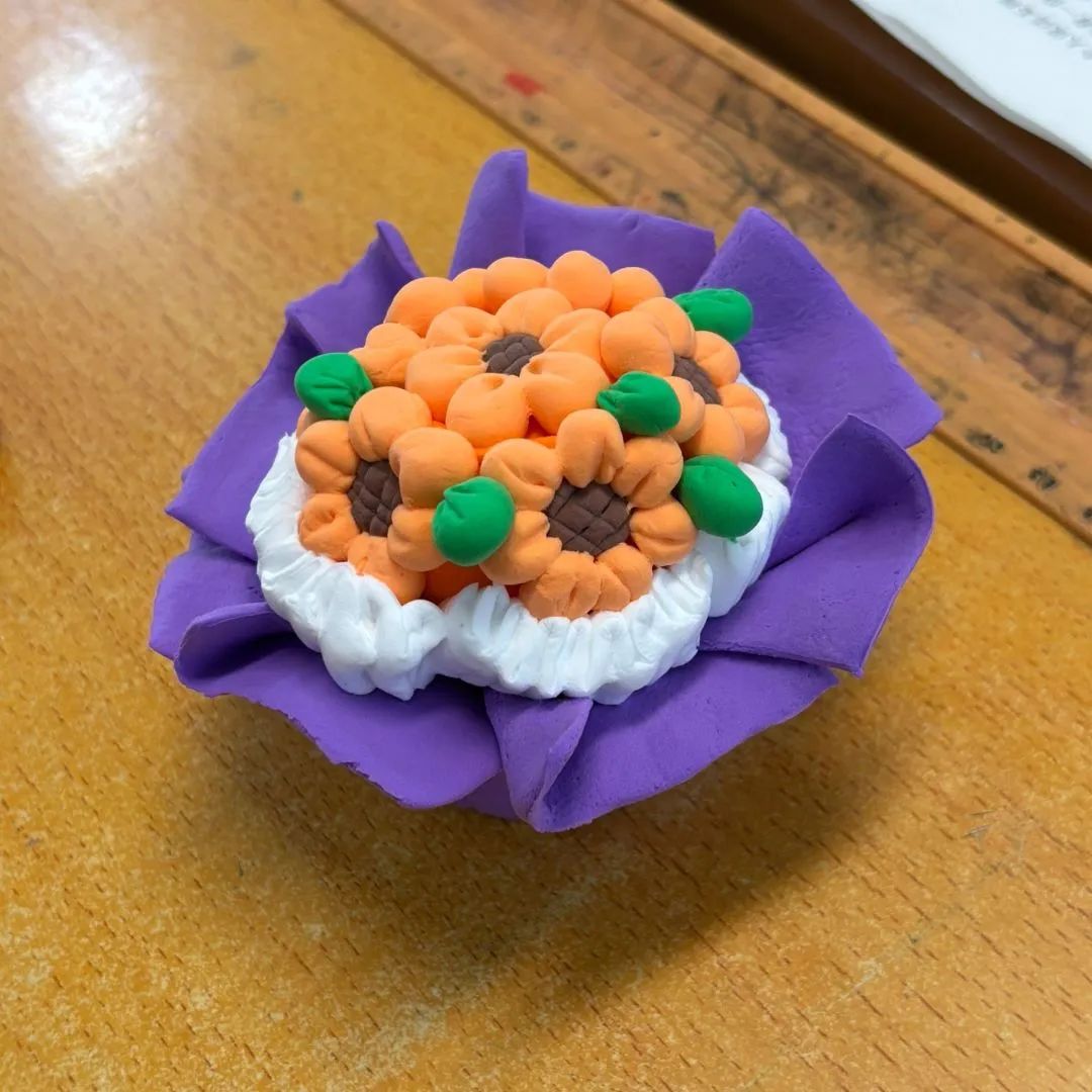 我用黏土捏了戴眼镜的小田老师,她总夸我颜色配得好,捏花瓣时还握着我的手教怎么卷边。现在看着桌上的老师小人儿和花篮,这些作品好像还带着手心的温度,是特别珍贵的纪念。