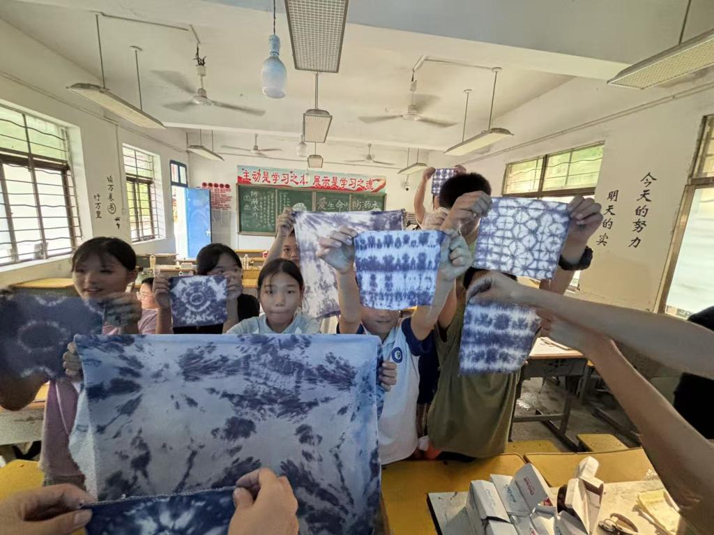队员董美祺、陈诺等人指导孩子们实操,通过折叠、捆扎等方式完成云染、五角星、扇形等纹样的扎结。经过折扭定型、靛蓝染色、密封固色和清洗拆线等步骤,棉布呈现出各种精致的图案。孩子们兴奋不已,不仅感受到了扎染技艺的独特魅力,也领悟到非遗工艺蕴含的匠心智慧。