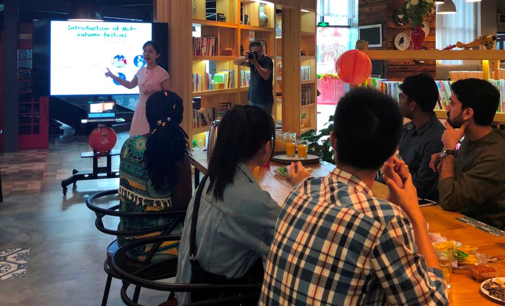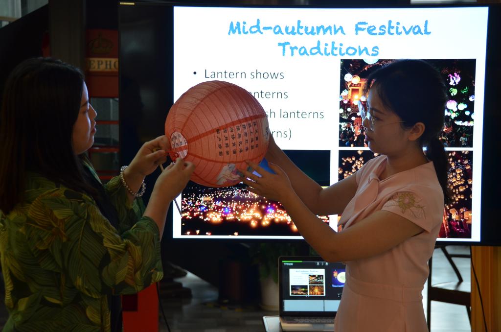 活动现场,张媛老师首先向国际员工由浅入深的介绍了中秋节的来历、传统习俗、相关传说,并请员工赏析了中秋相关的诗词。“但愿人长久,千里共婵娟”、“海上升明月,天涯共此时”,这些美妙的词句通过张老师的诠释,让国际员工们感同身受地理解了中秋节的内涵,并化解了他们身在异国他乡的思乡之情。介绍过程中,张媛老师通过教员工组装中秋灯笼、学习并朗诵《静夜思》、中秋知识小测验等互动形式,充分调动了国际员工学习的积极性和参与性。