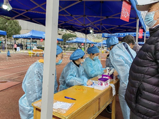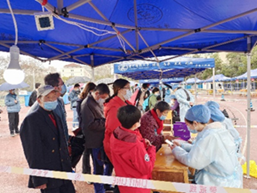 3月6日清晨,支部的党员同志便在中心操场集合,按照要求领取穿戴护帽、口罩、隔离衣等防护物资,并在现场医护老师的指导下掌握了基本的工作方法。根据校医院和志愿者协会安排,同学们被分为两个小组。一组负责现场的人员引导和疏散;另一组则被分配到各个信息登记窗口进行试剂管贴标签、人员信息核对、棉签分发等工作。尽管天气越来越寒冷,还下起了淅淅沥沥的小雨,但是同志们的工作热情却没有丝毫减退,支部不少同志累计工作时长达8小时。尽管工作过程中遇到了扫码识别困难、人员信息不全等问题,但同志们始终保持耐心细致,着力解决每个细小问题。在医护老师的悉心指导下,同志们的配合愈来愈默契,工作效率攀升,一定程度上分担了医护人员的工作压力。