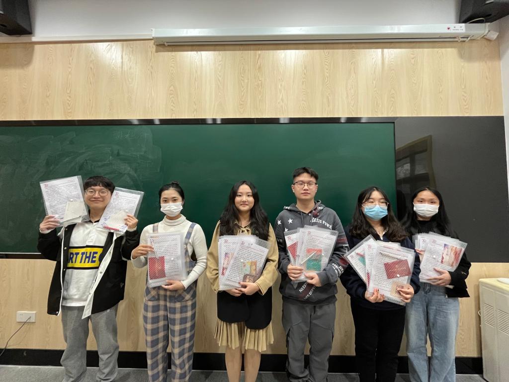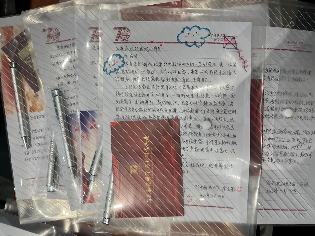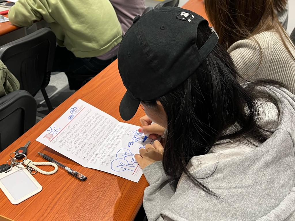 最后,伴随着轻松欢愉的背景音乐,志愿者们认真地给小朋友们写信,字迹清秀工整,内容温暖励志,还配以充满童心、漂亮有趣的手绘图案。在信中,各位同学从自身角度出发,娓娓道来、循循善诱,鼓励孩子们明德立志、好好学习、努力奋进,未来做一个对国家、对社会有贡献的人。在收集好所有信件后,研究生党务中心实践部的成员们将书信、纪念品放入文件袋中封存好并寄出。