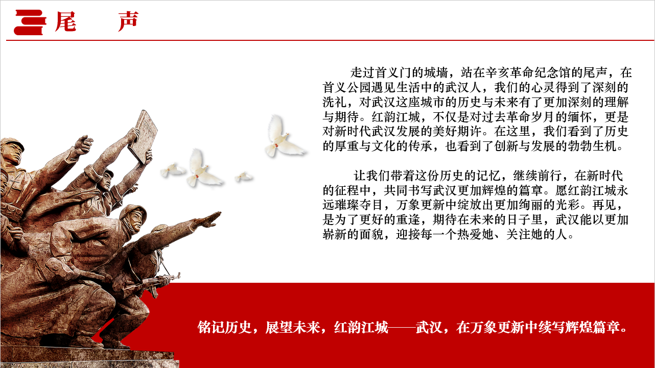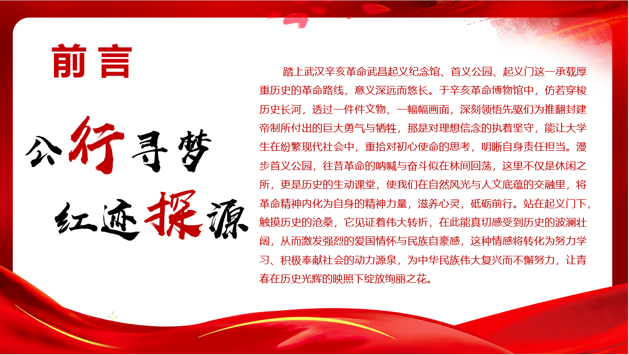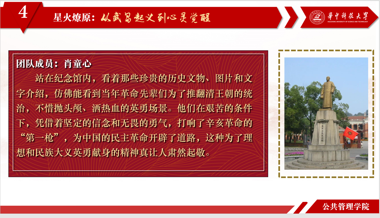 走过起义门、辛亥革命武昌起义纪念馆和首义公园,我仿佛穿越回了那个风云激荡的时代。庄严肃穆的起义门带我们回忆起义的绝勇与坚定,纪念馆中的每一件展品都承载着历史的记忆,首义公园的草木似乎仍在诉说当年的革命故事。这次的红色实践,让我感受到了革命的艰辛与伟大,让我对革命先辈的壮举肃然起敬,我们要铭记历史,以史为鉴,不断努力提升自己,为建设更加美好的国家而拼搏。