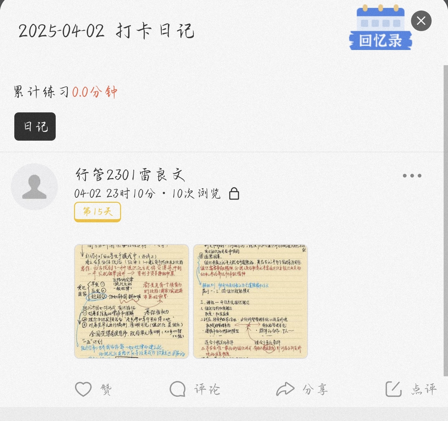 21天笔记打卡挑战虽已结束,但公管学子以笔为舟、以学为帆的精神仍将延续。希望同学们能将勤于思考、善于总结、乐于交流的习惯融入日后的学习生活中,在不断积累与沉淀中收获成长。