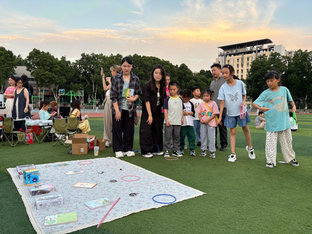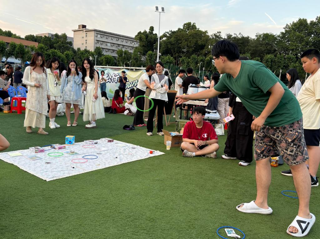 “快乐小画摊”成为热门打卡点,同学们用画笔表达对母校的眷恋和对未来的憧憬。“HUSTの青春物语”手工摊位展示了员工亲手制作的精美物品,凝结着华科大学子的美好回忆,成为毕业季独具情感的纪念品。由员工会文艺部策划的“欢乐套圈摊”成为最受欢迎的互动点之一,大家积极参与、欢笑不断,现场气氛轻松活跃。