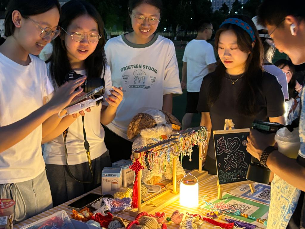 夜幕降临,市集灯光陆续亮起,吸引了大量师生参与。