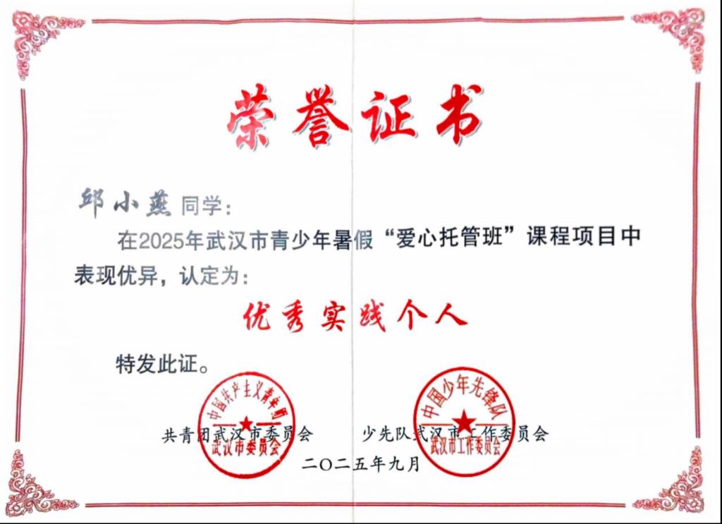 近日,2025年武汉市青少年暑假“爱心托管班”项目评选结果公布,伟德国际1946“公行至善”志愿服务队表现突出,荣获多项市级荣誉。团队获评“优秀实践团队”,何磊老师被授予“优秀指导老师”称号,行管2301班王慧、邱小燕同学获评“优秀实践个人”,充分展现了公管师生扎实的实践能力与昂扬的青春风貌。