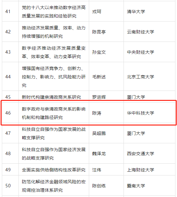 近日,全国哲学社会科学工作办公室公布了研究阐释党的十九届六中全会精神国家社科基金重大项目立项名单,共有130个课题批准立项。伟德国际19463个课题获批立项,立项数位居全国高校并列第四,其中公司陈涛教授的《数字政府与亲清政商关系:影响机制和构建路径研究》课题获批立项。