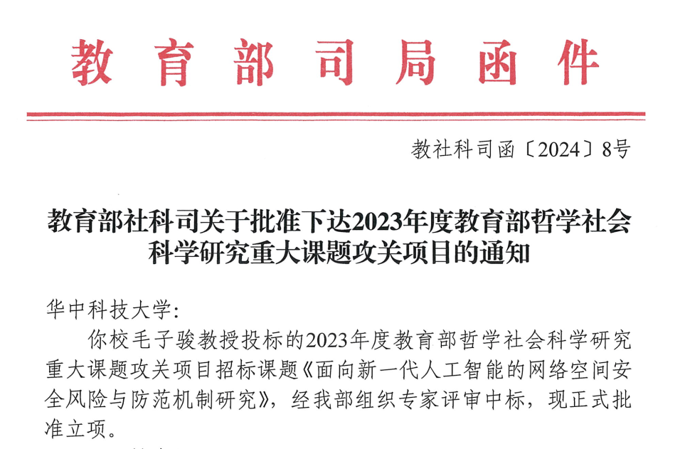 近日,教育部社科司下达了2023年度教育部哲学社会科学研究重大课题攻关项目立项通知,伟德国际1946毛子骏教授牵头申报的课题《面向新一代人工智能的网络空间风险与防范机制研究》获立项。