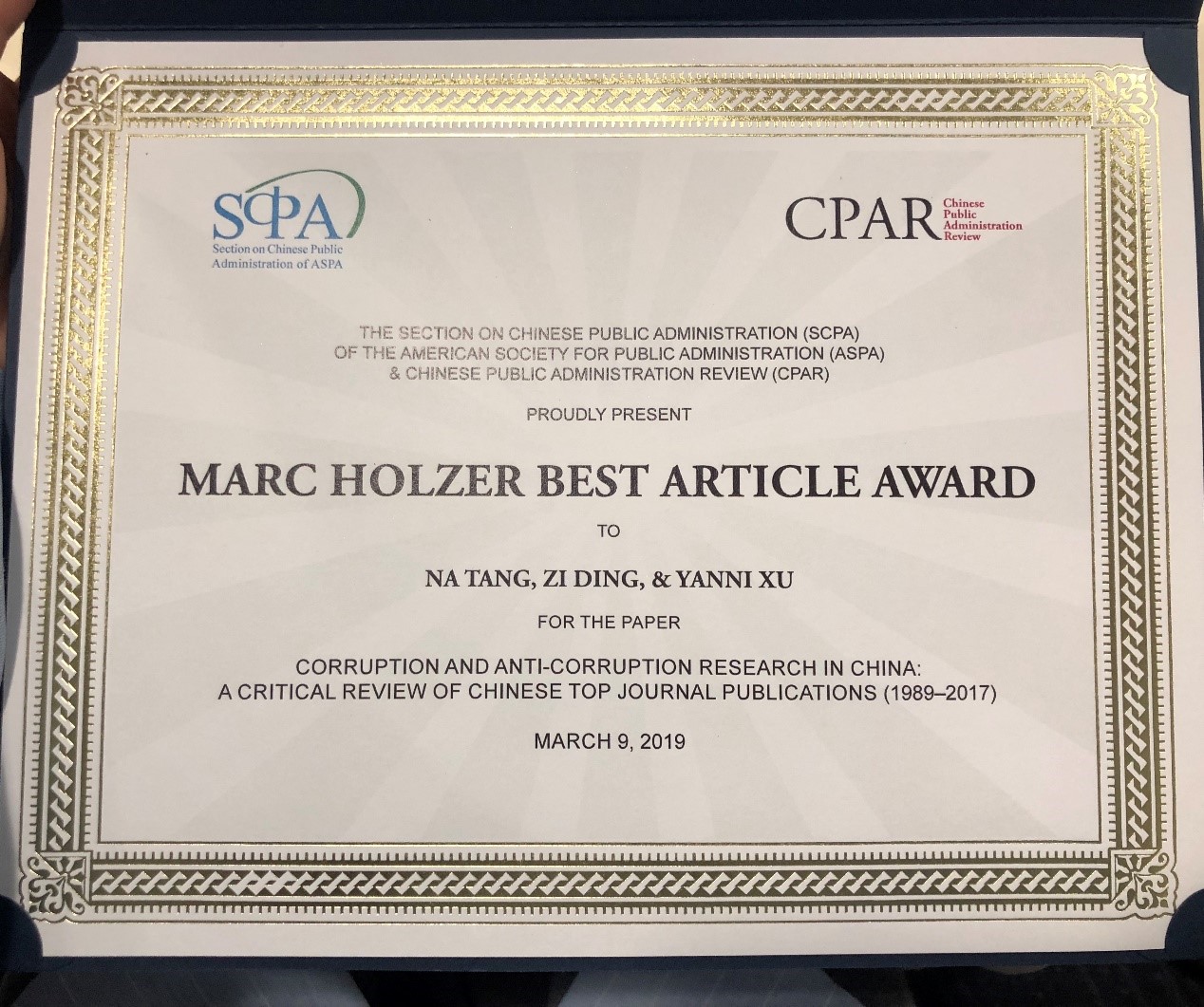 此外,由中国公共行政分会(SCPA)与Chinese Public Administration Review(CPAR)共同评选的年度最佳论文由公司青年教师唐娜及其合作者获得,他们的论文是Na Tang, Zi Ding, Yanni Xu: Corruption and Anti-Corruption Research in China: A Critical Review of Chinese Top Journal Publications (1989–2017),http://dx.doi.org/10.22140/cpar.v9i2.167。CPAR是美国公共行政学会(ASPA)中国公共行政分会(SCPA)的官方学术期刊,今年的最佳论文奖是由期刊编委会代表及特邀评审专家在2018年CPAR发表的所有学术论文中严格评选而来,获奖者在Section on Chinese Public Administration的会议上被授予Marc Holzer Best Article Award。