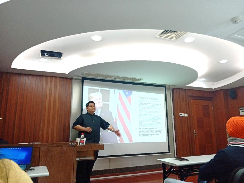 28日上午10:00-12:00,Piti Srisangnam教授以“Trade War:The End of American World Order and The Rise of China”为主题开展讲座,教授结合大量数据与案例,将4次工业革命与国家间的贸易关系与贸易地位联系起来,从历史的视角分析了贸易战。报告吸引了来自不同年级、不同国家的员工参加,与会师生展开了热烈的学术讨论。