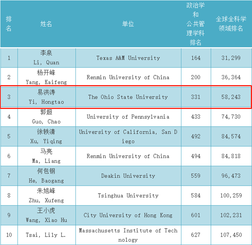 近日,斯坦福大学John P.A. loannidis和Elsevier团队研究人员发布了涵盖全球各个学科、近19万名顶尖科学家论文引用量的数据库,并对其终生影响力和2020年学术影响力进行排名。以政治学和公共管理学为主要领域的2020年全球政治学与公共管理学华人顶尖学者影响力排名中,共十位华人顶尖学者上榜,其中公司院友易洪涛位列第三。