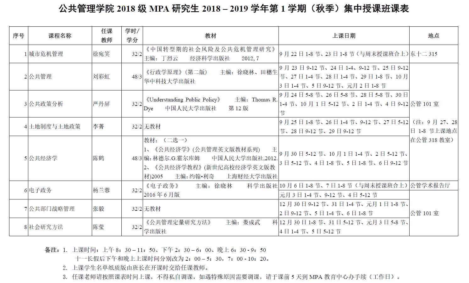 伟德国际19462018级MPA研究生2018-2019学年第1学期(秋季)集中授课班课表